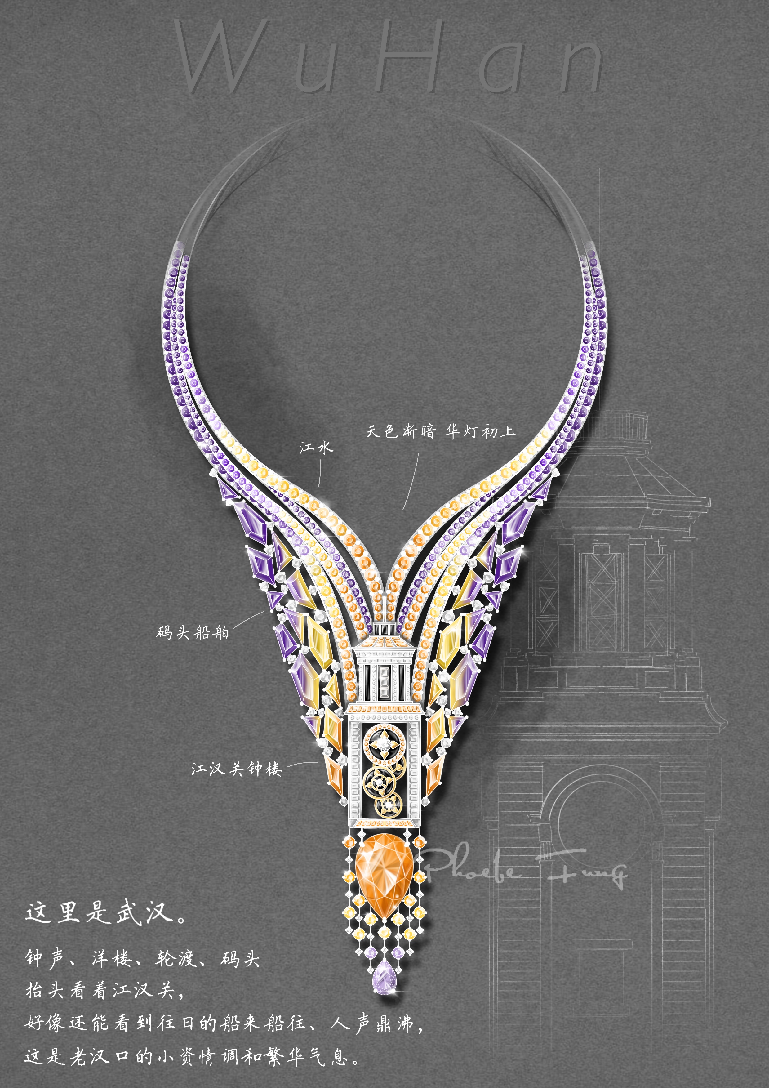 创作日记:设计这件的时候想把码头文化和江汉关联系起来,结合当时时兴的ArtDeco风格,总体造型轴对称设计、使用对比色、流苏、梯方切割宝石等复古元素。江汉关华灯初上,映照着江水和靠岸的船舶,渐暗的紫色中,这片橘色就是繁华。
