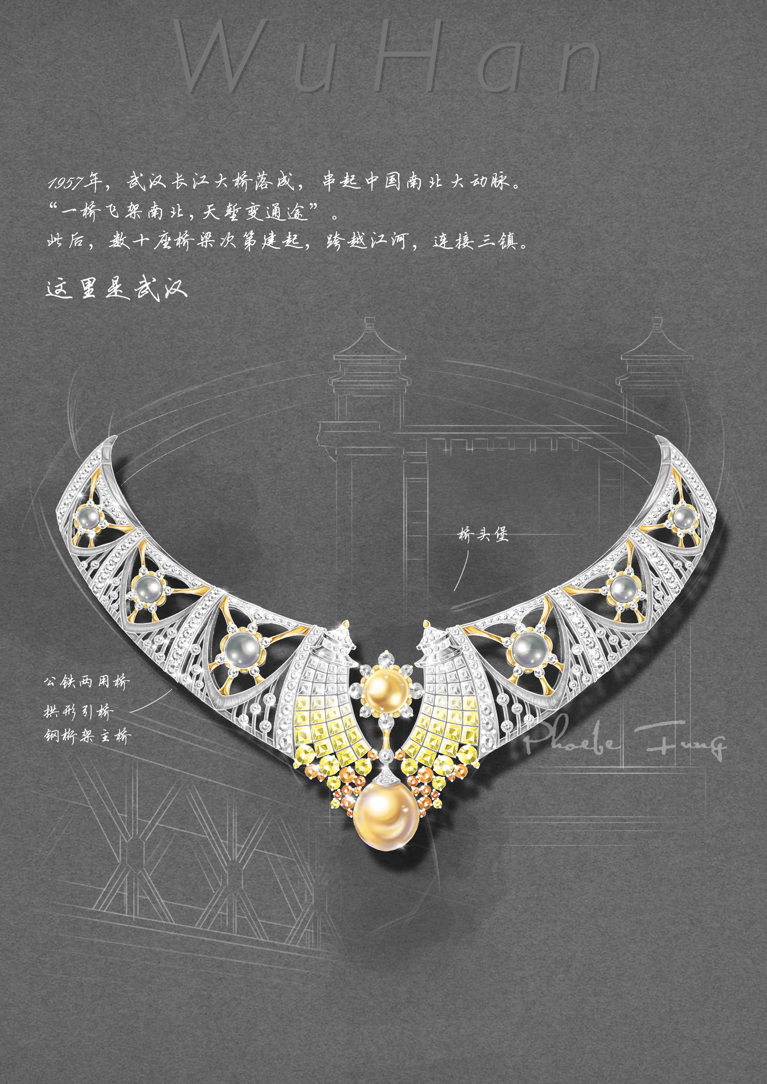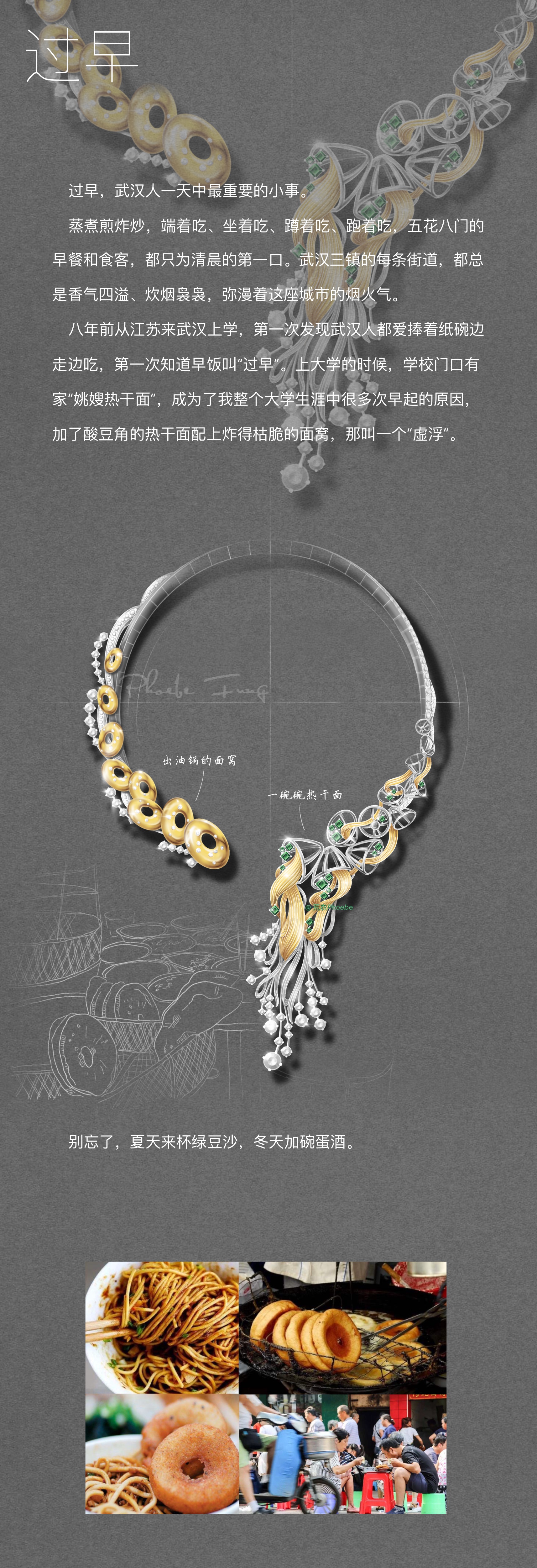 一组以武汉为主题的珠宝首饰设计《这就是武汉》,在微博上被广为转载。每一幅首饰设计图都惊艳了读者,一组看下来,更能感受设计师对武汉的浓浓的赞美,这是因为这位设计师在武汉生活了8年,武汉浓浓的古早味,历史与现代碰撞的城市,还有那浪涛、樱花,都是她的生活情画,她就是——方龙慧子,网名“荒农Phoebe”,首饰工作者,现任中国地质大学珠宝学院GIC设计教师。
