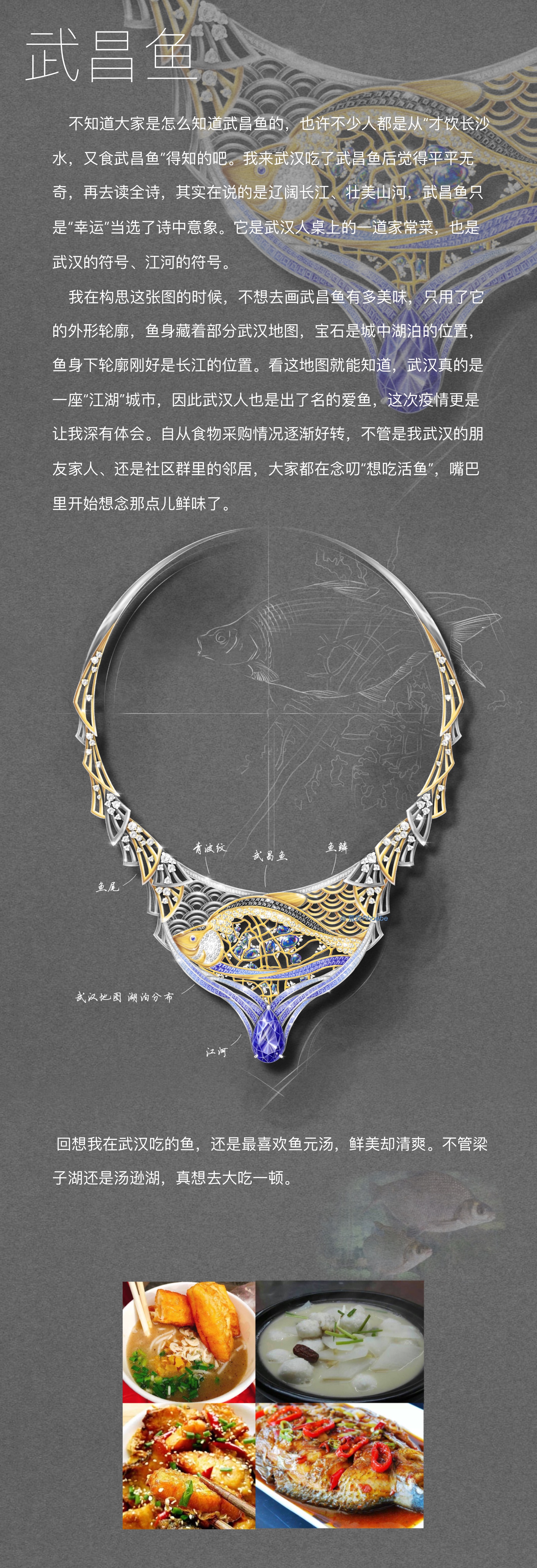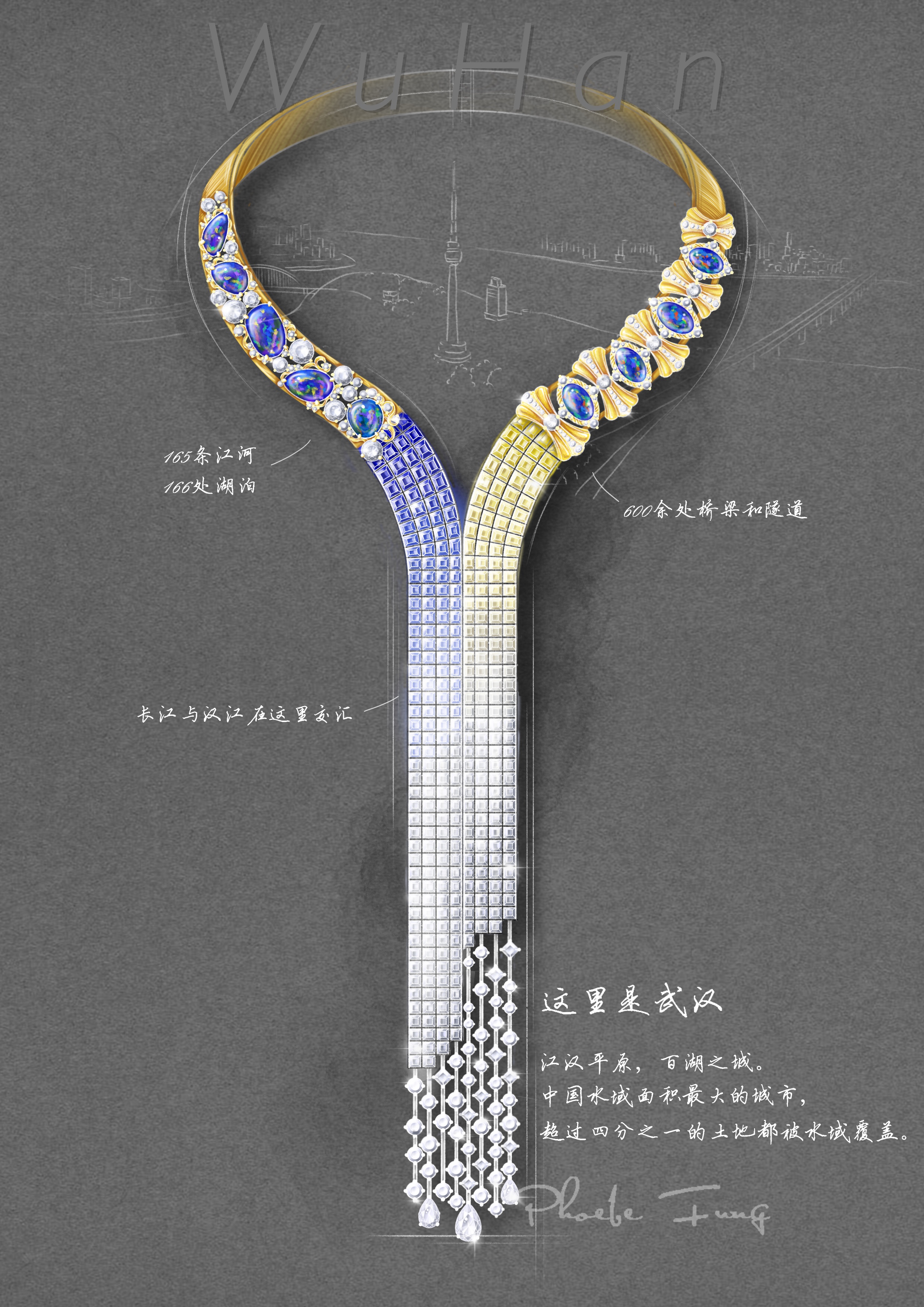 创作日记:“大江大湖大武汉”,每次回到武汉,都会收到这条短信。这件作品的灵感是来源于摄影师姜轲的一幅作品,画面中是长江与汉江的交汇,黄色蓝色的交汇,壮阔又柔美。用大面积的宝石铺陈描绘出这个场景,欧泊和金属抽象表达了武汉的湖泊群和桥梁。