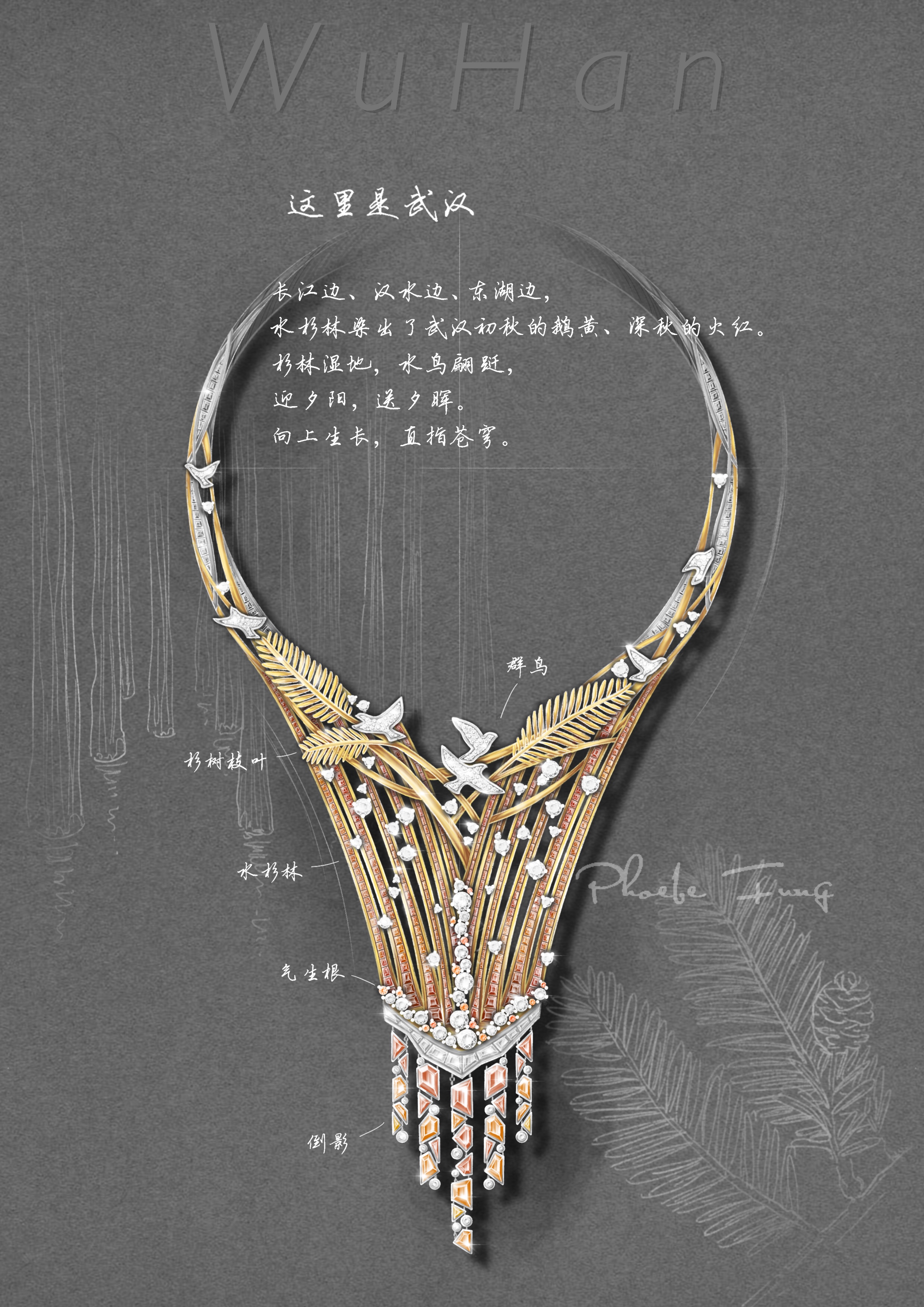 创作日记:这件首饰记录了我记忆中第一次去水杉林看见的场景。在武汉的落雁岛,我先生带我去看水杉,教我认水杉的气生根,告诉我水杉是濒危植物。水杉真的特好看,有浪漫的颜色,有倒影和飞鸟,有枝桠间的光线,有清瘦挺拔的姿态。