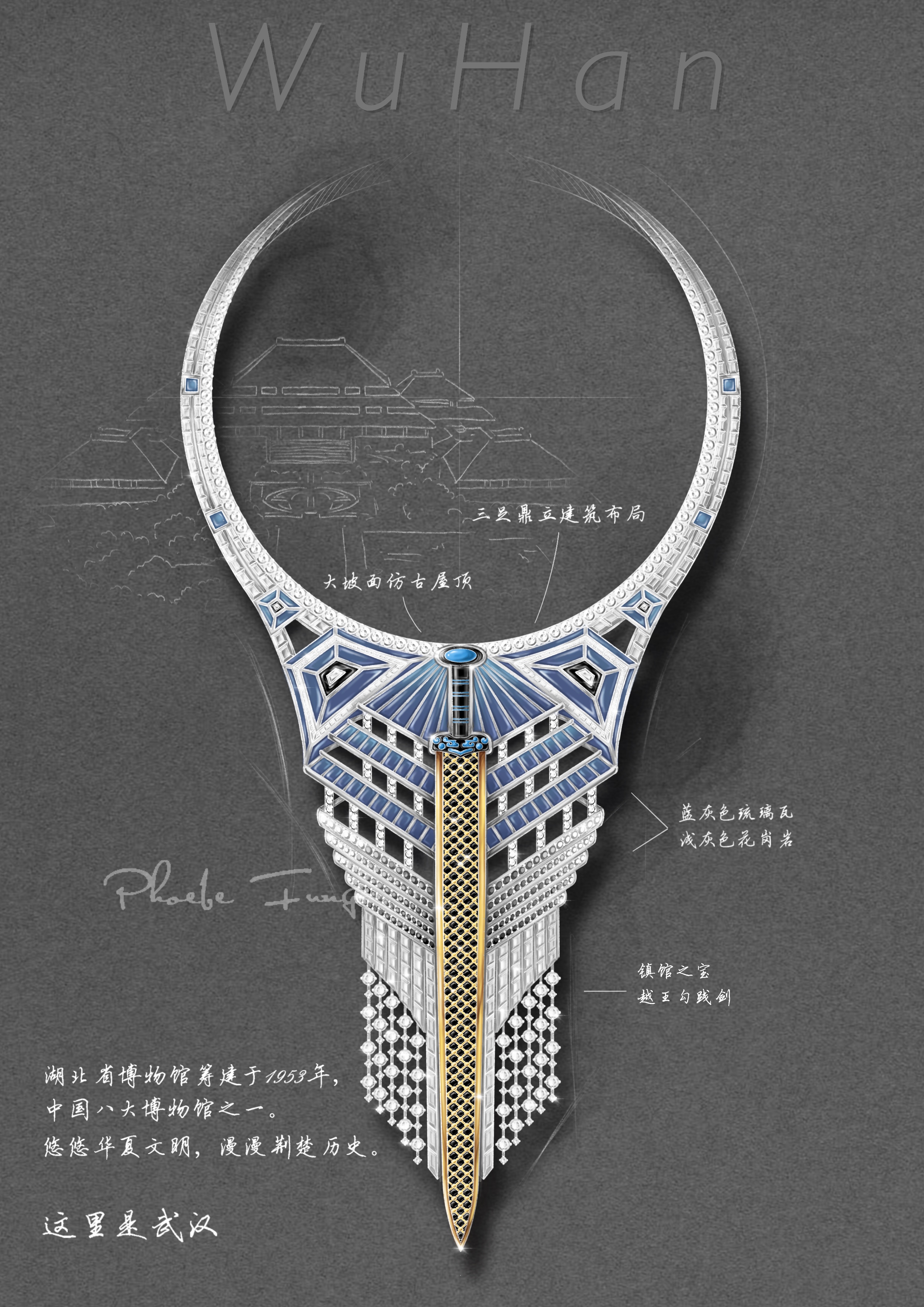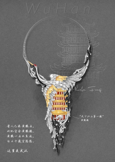 创作日记: 提到武汉一定会想到黄鹤楼,虽然武汉本地人不一定会去,但是在武汉的我,这八年陪着外地来的亲友去过无数次,留下了很多回忆。我在这件首饰中加入了象征着福寿绵长的黄鹤意象,造型是鹤首向上,羽翼用一种保护的形态包裹住黄鹤楼,寄托了我的美好期望。