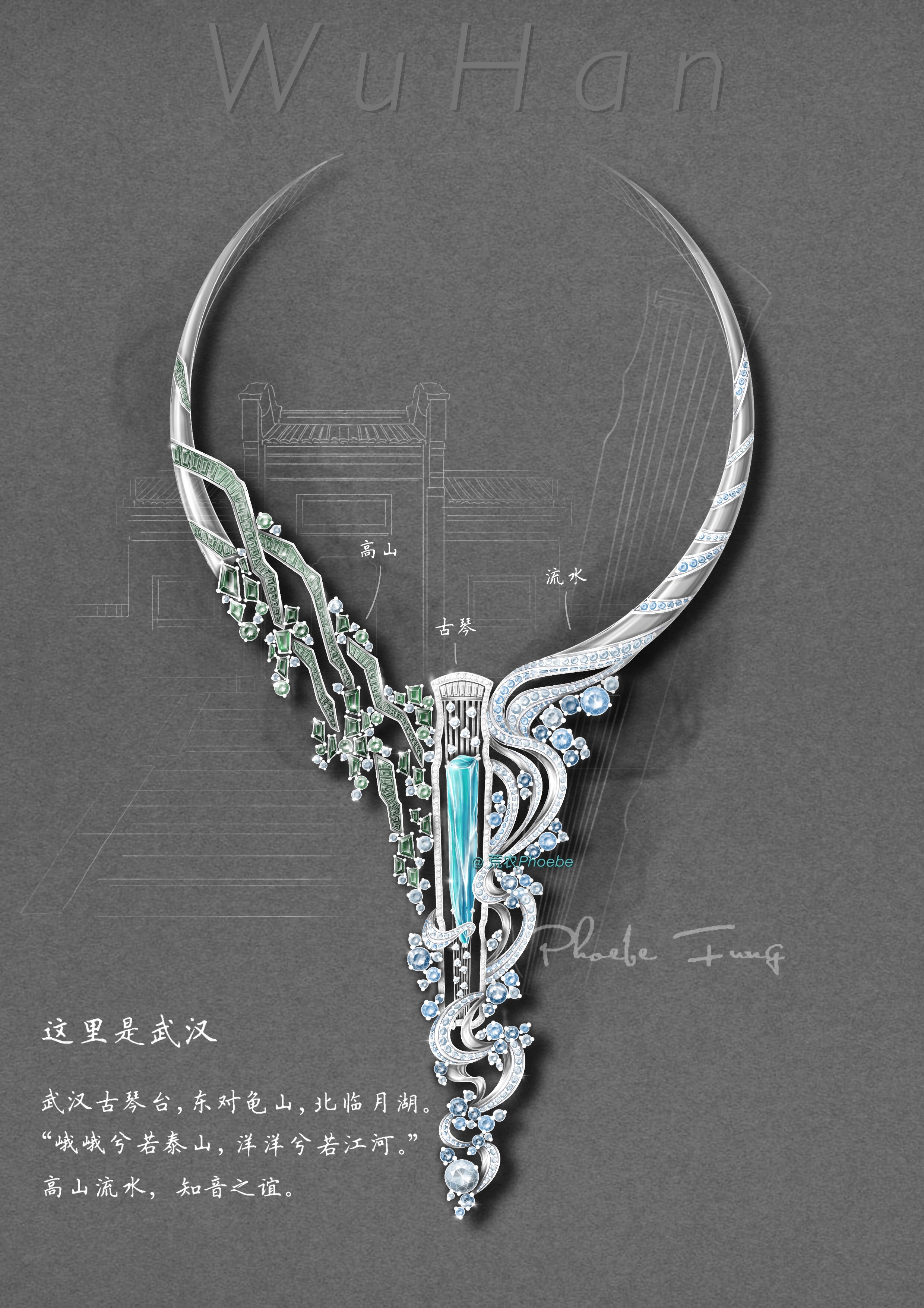 创作日记:武汉古琴台又叫“俞伯牙台”,高山流水遇知音,纪念伯牙子期的知音之谊。武汉古琴台又刚好在龟山西脚下的月湖之滨,幽静秀丽,与伯牙子期的故事遥相辉映,共同构成了一个情境相交的艺术境界。在设计中想突出山与水的象征与隐喻,以古琴相连点题,曲高和寡,知音难觅,这些都如宝石般珍贵美好。