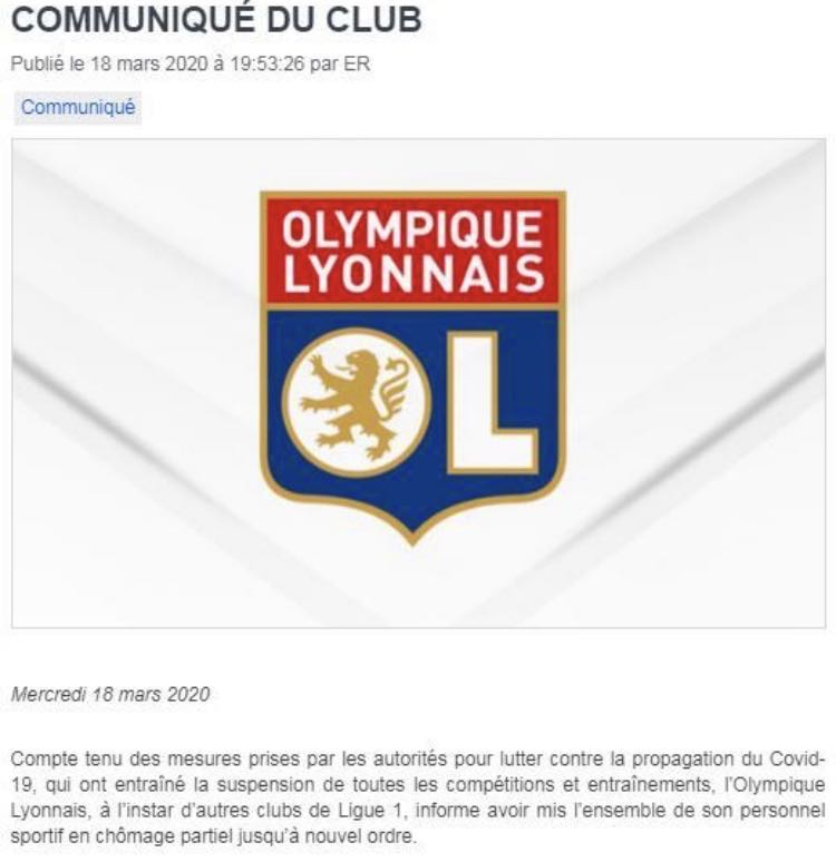 法甲方面,里昂俱乐部宣布,鉴于联赛和训练已暂停,所有球员将被列入暂时失业名单,俱乐部将申请“暂时性失业补助”,球员将获得部分工资,这一做法将持续到直到新的政策出台前,而此前,蒙彼利埃、亚眠、尼姆三甲法甲俱乐部已将球员列入暂时失业名单,球员们可从国家领取失业补助金。