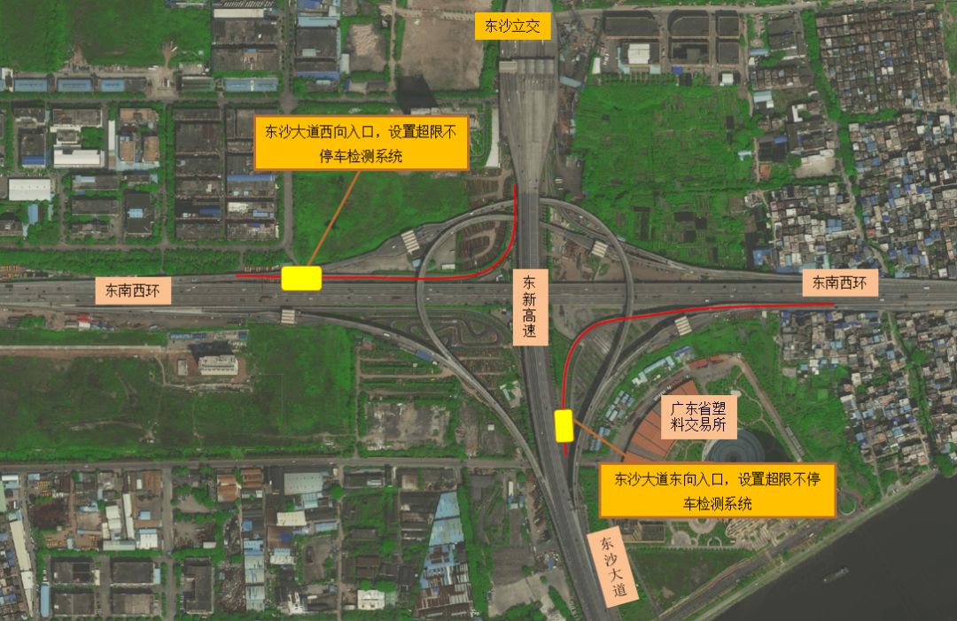 东行方向:入口匝道与地方路的分流鼻处附近平面线形曲率半径较大,纵坡较小,宜在东沙大道匝道入口布设不停车超限检测系统设备。西行方向:不停车超限检测系统布设在东沙大道西行匝道与东新高速匝道合流鼻端前,此处为直线段,且纵坡较小,适宜系统布设。