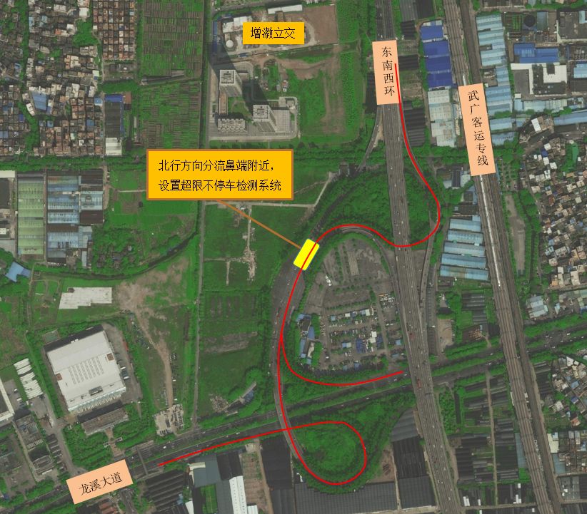 增滘立交为东南西环与龙溪大道相交立交,为Y形+喇叭立交,有收费广场,收费站已拆除。龙溪大道上有东、西向两入口匝道,均为单车道。入口匝道汇流后经收费广场(收费站已拆除)。东南西环在海南立交与增滘立交之间路段北往南方向现状已设置了不停车超限检测系统,因此本立交仅需考虑北行方向。不停车检测系统安装收费广场北行方向匝道分流鼻端处,共2车道。