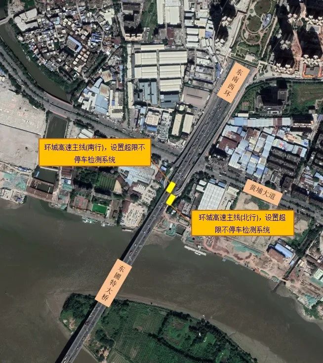 东圃特大桥南、北侧分别与新洲立交、东圃立交相接。新洲立交为东南西环与新港中路相交立交;东圃立交为环城高速与中山大道、黄埔大道相交立交,交通转换较复杂。东圃特大桥位于直线段上,现状为双向6车道+2车道应急车道。根据广州重点道路治超非现场执法监测网络建设项目计划安排,在东圃特大桥北岸桥头主线南北向各布设不停车检测系统。
