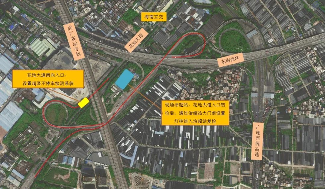 本立交收费广场出环城高速侧现有治超站,现状收费广场前后分合流鼻端距离较长(约320米),有条件结合现有路侧治超站进行复测劝返,为保证行车安全,需在治超站大门前后设置灯控,在花地大道南进东南西环分流鼻处附近布设不停车检测系统。由于花地大道南北行方向已由沙尾大桥布点覆盖,因此只需在花地大道南南行方向入口处布设不停车检测系统,共2车道。