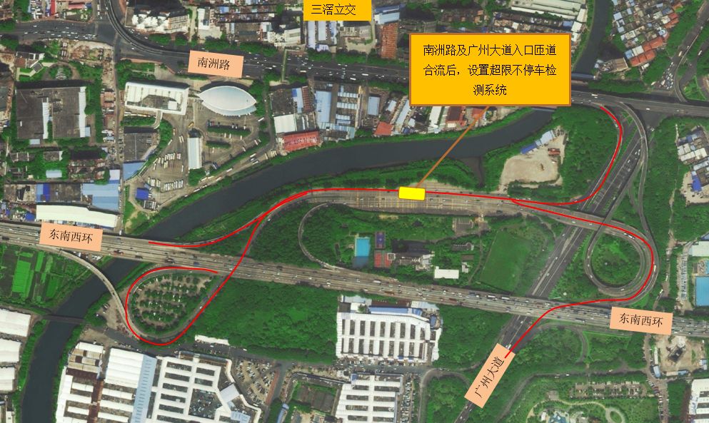 三滘立交为东南西环与广州大道相交立交,有收费广场,收费站已拆除。广州大道上有南、北向两入口匝道,均为单车道。入口匝道汇流后经收费广场(收费站已拆除)。收费广场进环城高速一侧现有治超站。治超站大门紧邻入口匝道合流鼻端。不停车检测系统安装在现状收费广场中央直线段,共4车道。