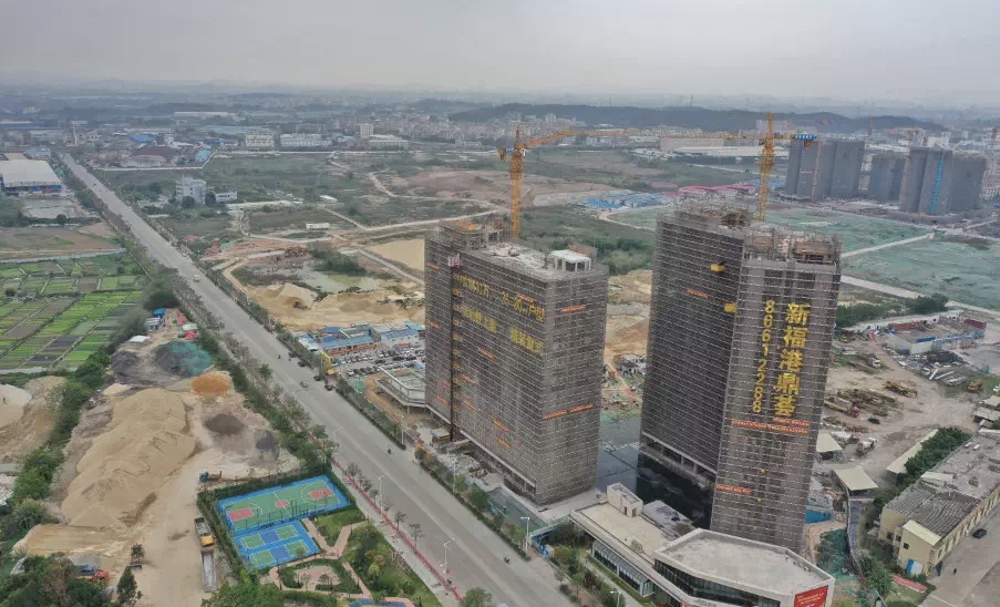 在江高镇中心城区宜居创业中心重要布局项目——江村村留用地项目新福港·鼎荟施工现场,锤打声、机器轰鸣声响彻工地,塔标、人货梯运送施工材料,工人忙个不停……一派建设热潮。