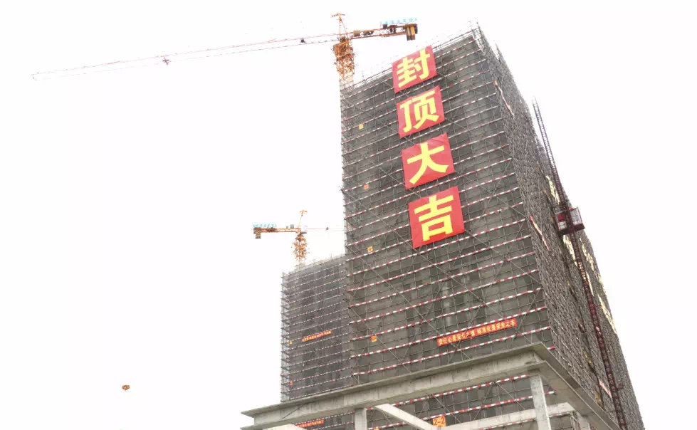 远远望去,“封顶大吉”四个大字已经“爬”上建筑。这里是新福港•鼎荟项目一期,涉及两栋主体建筑,目前,大部分工人主要在主体建筑内部进行墙体施工,下一步将推进外立面施工。