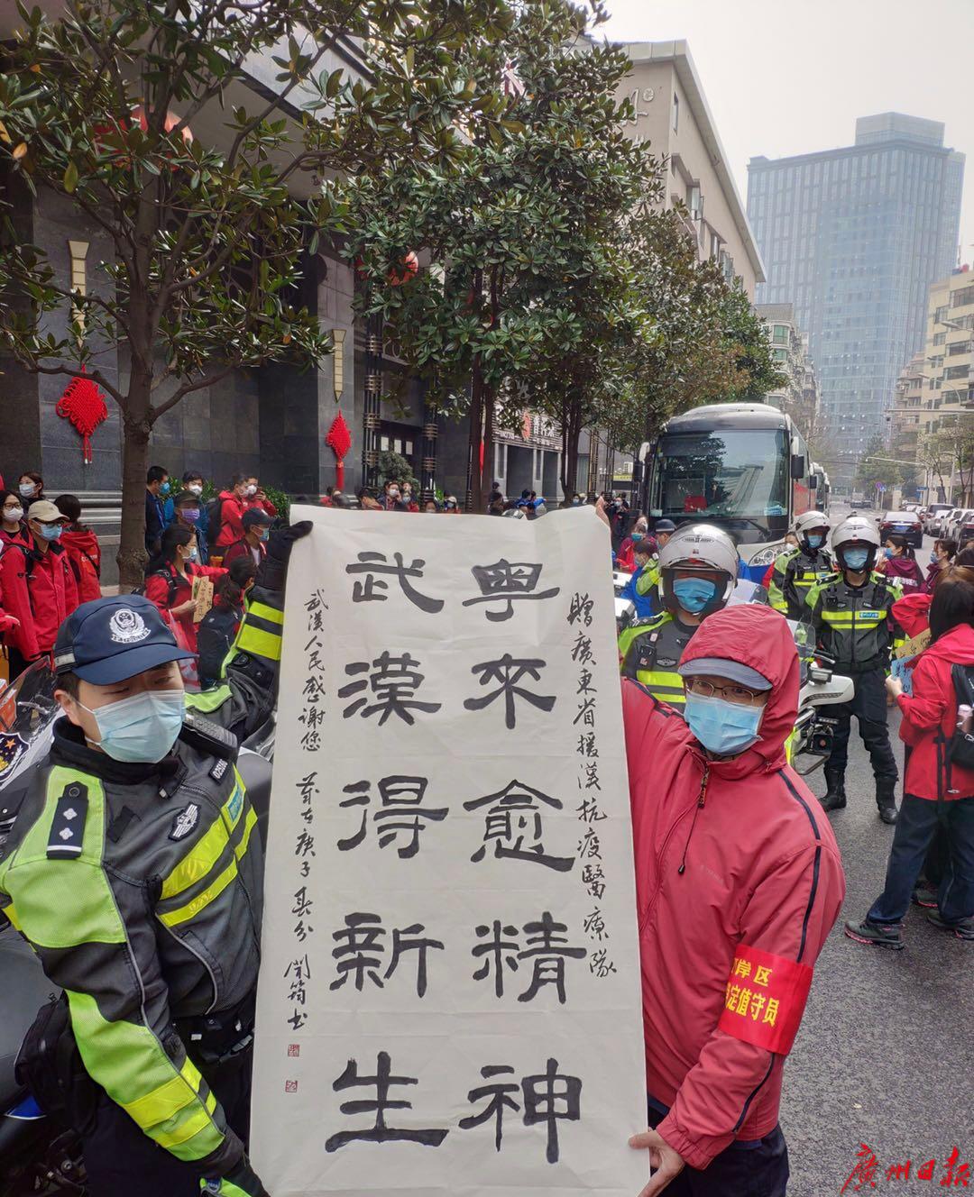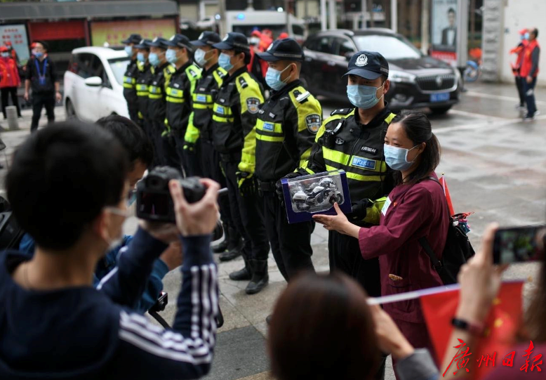 早上8点,在广东第一批医疗队驻地酒店门口,队员们争相与前来护送的武汉交警铁骑合照留影,交警们则向医护人员代表送上纪念礼物。
