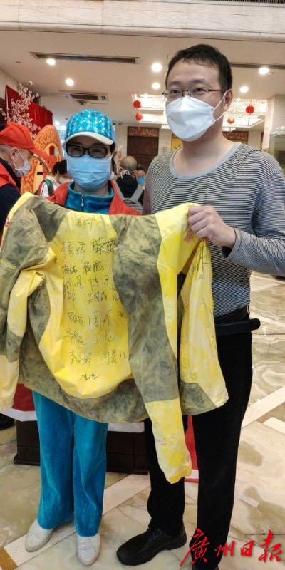 出发机场前,广东医疗队队员、广东省妇幼保健院驰援武汉医疗队队长唐远平请队员们在他的“战袍”上签名留念,从援疆到战疫,这件衣服一直陪伴着他。