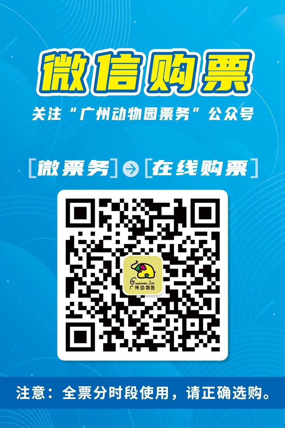 为避免出现人群扎堆现象,广州动物园实行分时段限量售票,目前仅开放实名制网上购票渠道(电子门票从3月23日零时起上架)。游客需扫描下面二维码,选择右下角“微票务”——“在线购票”,选择准确的时段、日期进行购买(每天分4个时段限量发放,请游客注意提早预订门票并按时段来园);暂停接受团体(30人或以上)预约参观。