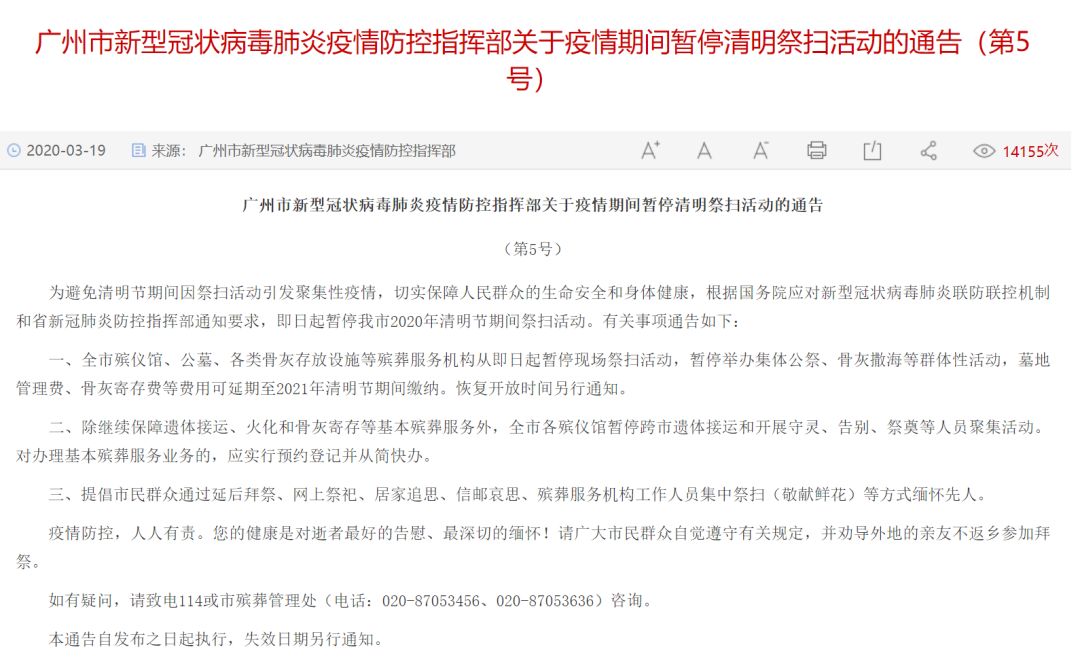 据悉,经市新冠肺炎防控指挥部同意,2020年清明节期间,广州市各殡葬服务机构拜祭场所暂停祭扫活动。