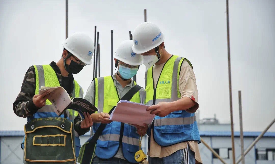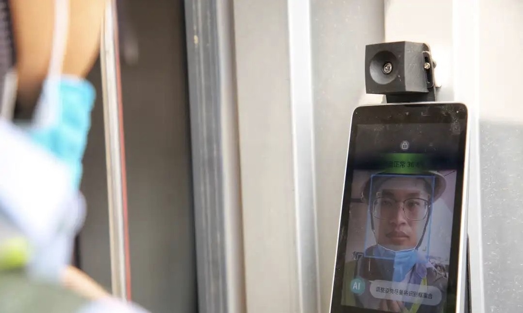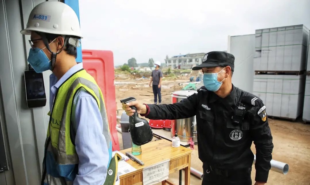 在施工期间,工人们“刷脸”测体温才能进入工地,工地安全员拿着小喇叭巡查工地施工安全。“一般安全员提醒的内容是让工人注意施工安全,现在疫情期间,又多了一项任务,就是提醒工人做好防疫安全。”项目负责人表示。
