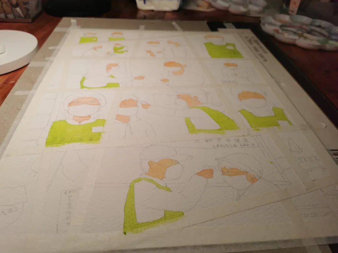 她没有选择用照片纪实,而是通过画笔,截取一个个片段进行创作。过程中,最难得的是构思,以什么技法展现呢?想达到怎样的画面效果?构思好以后,接下来的步骤对于她这位美术老师来说是水到渠成的事,然而,创作最快也要花一天的时间。张紫惠说:“我希望通过画作带出正能量,大家齐心协力,共度难关。”