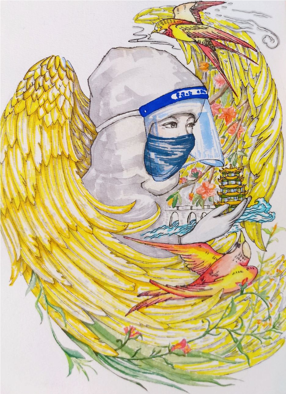 创作说明:“我活在这片土地上,我要守护这它!”面对疫情,医护人员勇于担当,庇护着这座城,只等燕归来,还看樱花最美时。