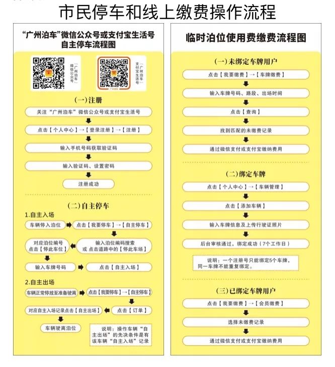 据介绍,车主缴纳泊位使用费可采用线上支付和线下支付两种方式:采用线上支付的,通过“广州泊车”微信公众号、支付宝生活号的“自主停车”服务模块进行自主操作,自助缴费。