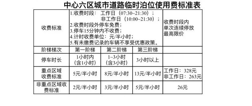 据悉,为引导不同区域道路泊位的停车需求,收费标准按照重点区域高于非重点区域的原则,对不同区域的道路泊位规定了不同的使用费标准和最高限价。