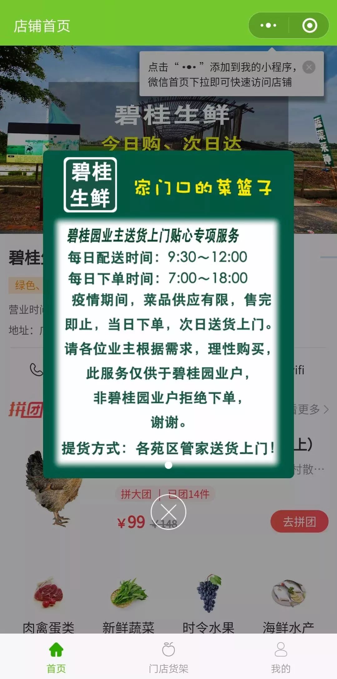 随着服务措施的一步步完善,广碧物业又考虑到,如果居民都聚集在蔬果便民服务点购买,也会有感染的风险,而且还有一部分居家隔离或身体不便的业主无法下楼购买。于是,碧桂园又引入了下单小程序,有需要的业主可以直接小程序下单,第二天由管家取货,免费配送上门。