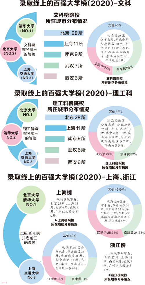 广州日报数据和数字化研究院(GDI智库)基于2019年度全国各省(自治区、直辖市)院校招生录取分数,构建数据模型,科学评价全国1346所本科批次招生院校(其中含190所专科院校的本科录取批次),研制推出四大榜单:“录取线上的百强大学榜(2020)-文科”“录取线上的百强大学榜(2020)-理工科”以及“录取线上的百强大学榜(2020)-上海”“录取线上的百强大学榜(2020)-浙江”。上海、浙江两地试点高考综合改革后考试招生不再区分文理科,故单独发榜。