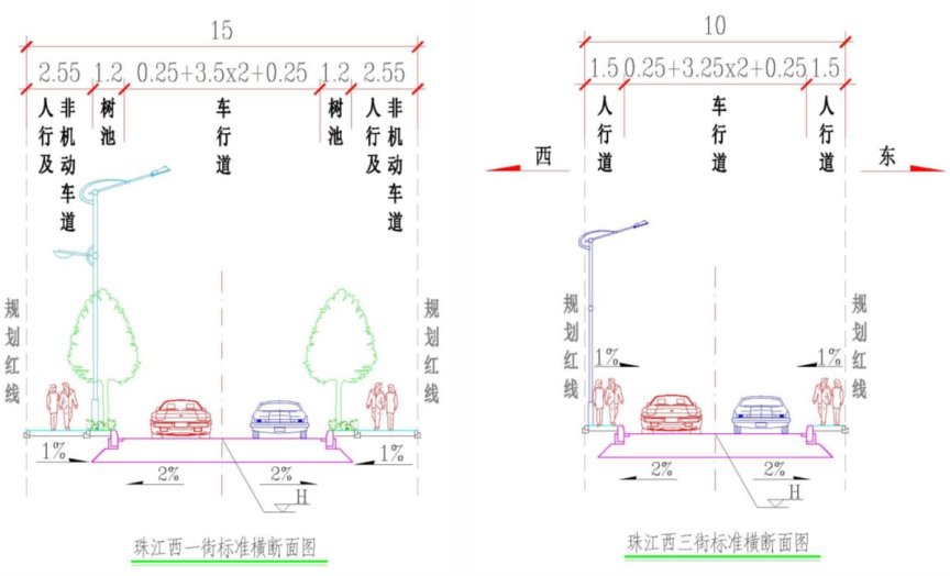其中,珠江西一街(西三街-华夏路)段呈U形走向,起于粤海总部集团大厦和富力盈通大厦之间,止于富力盈信大厦与雅居乐中心之间,并与华夏路相交,规划路宽15米,道路长度531.241米。现状为11米的双向两车道,两侧部布设有人行道,行人出行条件较好。