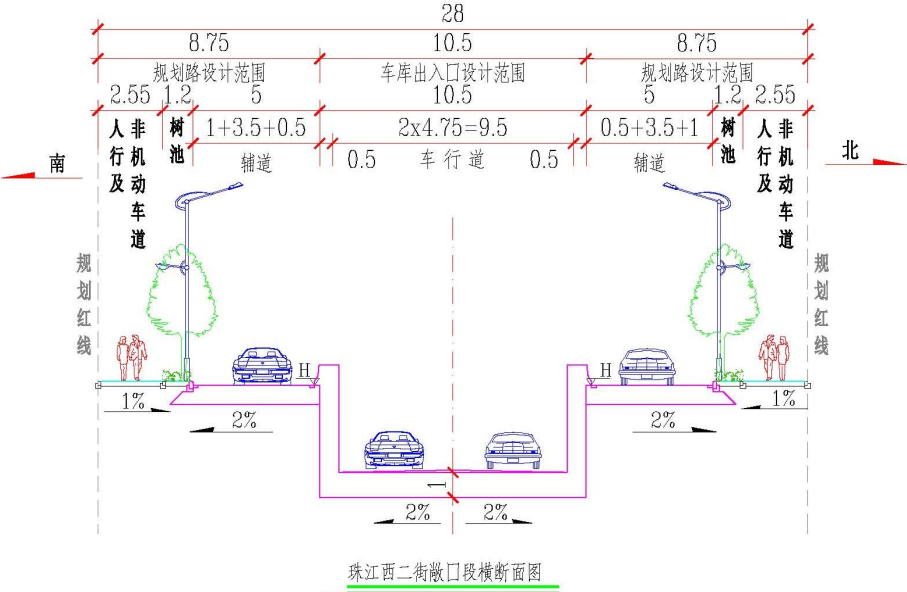 由于三条道路现状路段与规划线位、红线及断面不符,古本次项目将拆除现状路段,并按照规划红线重建处理。同时,这三条道路主要功能为解决珠江新城核心区范围内个地块的交通转换,因此道路平面设计与车库出入口接顺;八区地下停车场珠江大道双车道出入口设于珠江西二街中央。