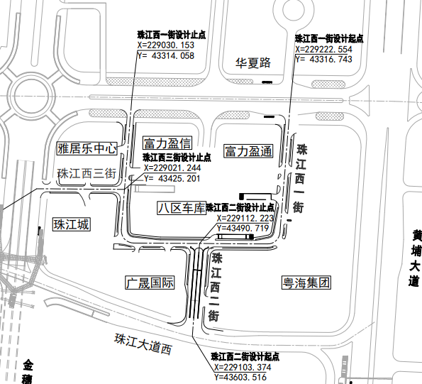 据记者了解,本次是涉及范围为珠江新城核心区内珠江西一街、珠江西二街、珠江西三街,道路红线宽度10~28米,道路规划为城市支路,双向两车道至四车道,道路总长750.980米,设计车速30公里/小时。三条即将施工的是市政规划道路位于黄埔大道、珠江西路、华夏路之间,周边有粤海总部集团大厦、富力盈通大厦、富力盈信大厦、雅居乐中心、珠江城、广晟国际大厦等地标建筑,区内交通通过珠江大道东,珠江大道西的单行逆时针循环系统和周边支路网络解决。