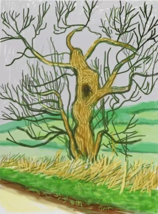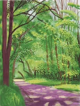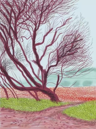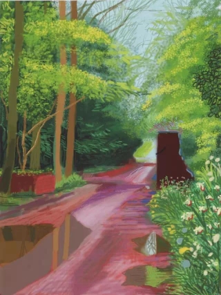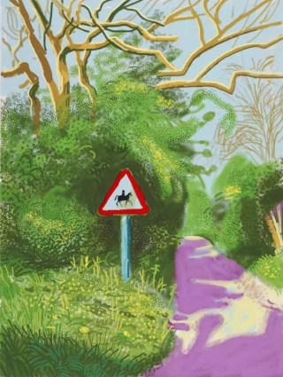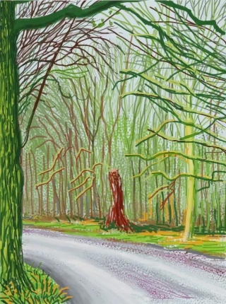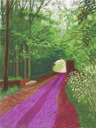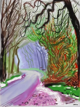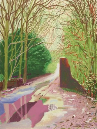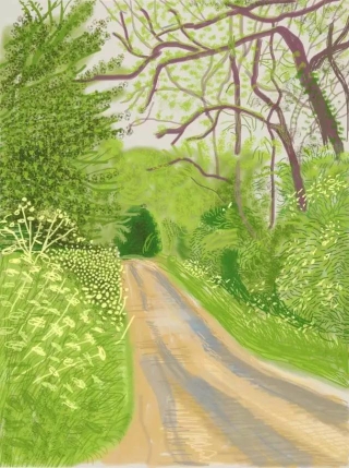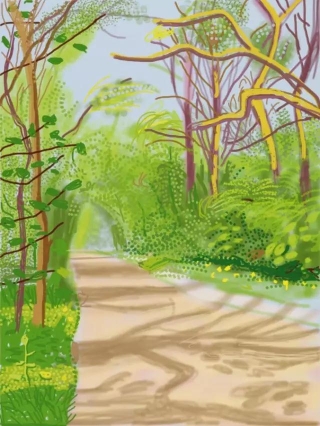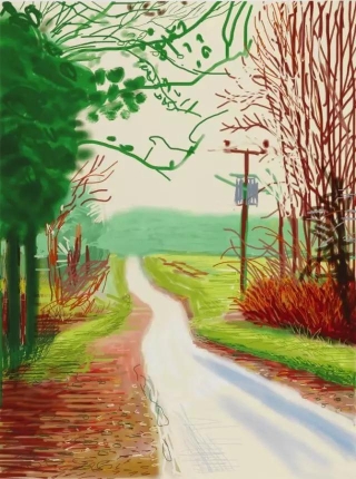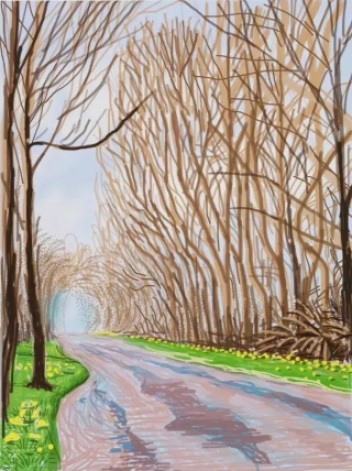 2020春天来临,当全世界的医生和卫生专业人员都在努力拯救生命时,82岁的著名艺术家大卫霍克尼决定为这个被病毒感染的世界尽自己的一份力量。霍克尼寄出了一幅名为“记住 它们(病毒)不能取消春天”的新画作,以鼓舞全世界人民的精神。他用iPad创作的这一组画作《春天来了》,其中有20幅力作集中描绘了东约克郡的田园风光。与他以往的油画作品相较,田园题材是大卫一向的最爱,画面保留了他惯用的鲜明的色彩,和平板绘画特有的电子笔触,但完全不影响画家对树枝树叶的描绘,工具完全不会对画家作品的艺术性造成影响,他在作品备注为综合材料。