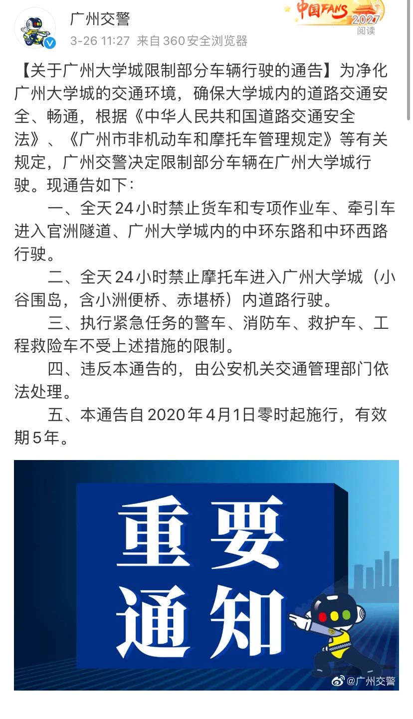 3月26日,广州交警发布《关于广州大学城限制部分车辆行驶的通告》,有效期5年。4月1日起,全天24小时禁止货车和专项作业车、牵引车进入官洲隧道、广州大学城内的中环东路和中环西路行驶,禁止摩托车进入广州大学城(小谷围岛,含小洲便桥、赤堪桥)内道路行驶。