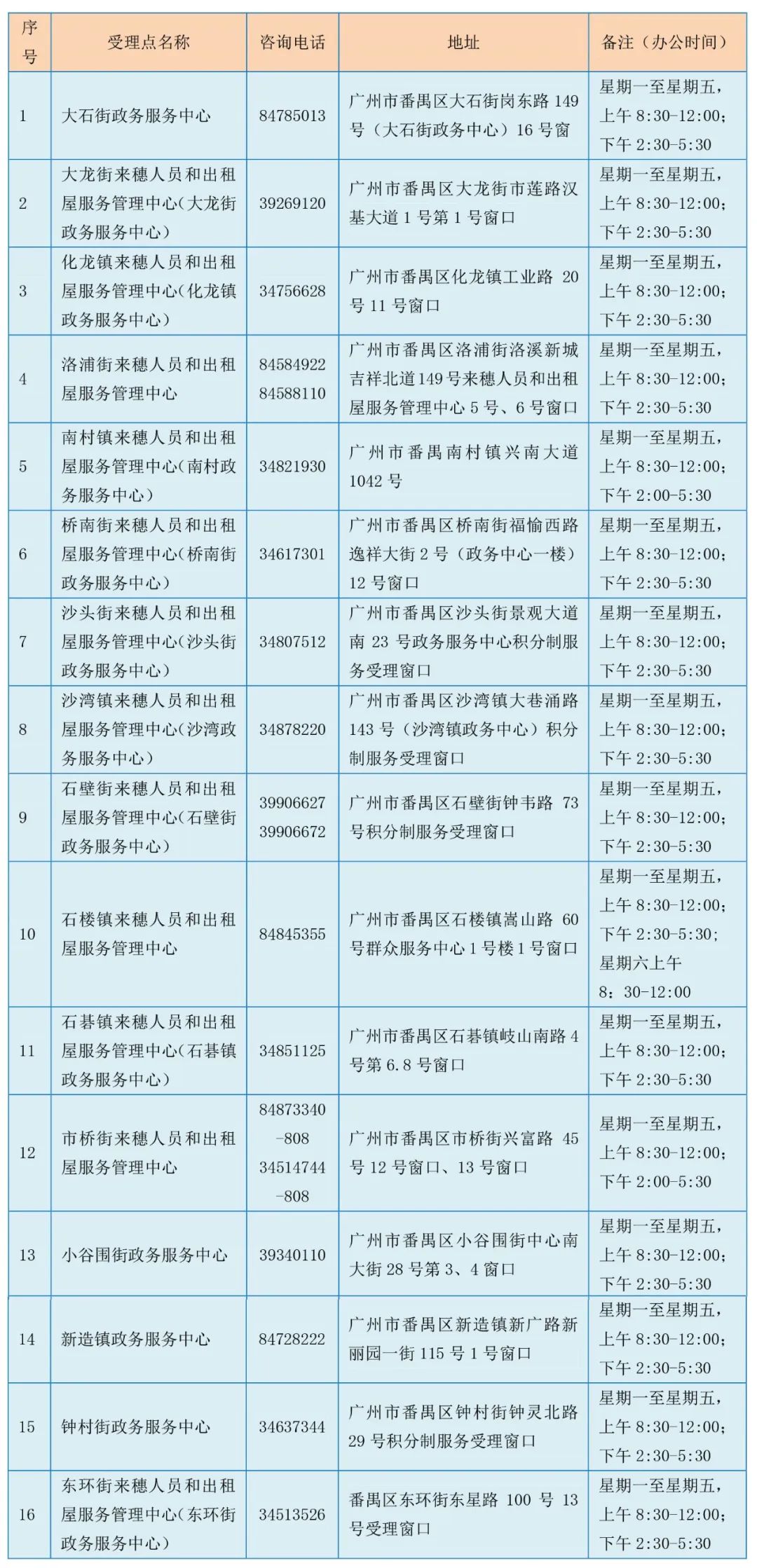 番禺区积分制服务受理网点一览表