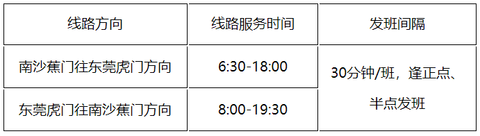 3月28日起,南沙K6路公交快线恢复运营啦!小南从南沙交通部门获悉,为方便市民出行,自28日首班车起,南沙K6路公交快线(蕉门公交总站-东莞虎门中心区客运站)将恢复正常运营。线路运营计划显示,南沙蕉门往东莞虎门方向线路服务时间为6:30-18:00,东莞虎门往南沙蕉门方向为8:00-19:30,线路发班间隔为30分钟/班,逢正点、半点发班。