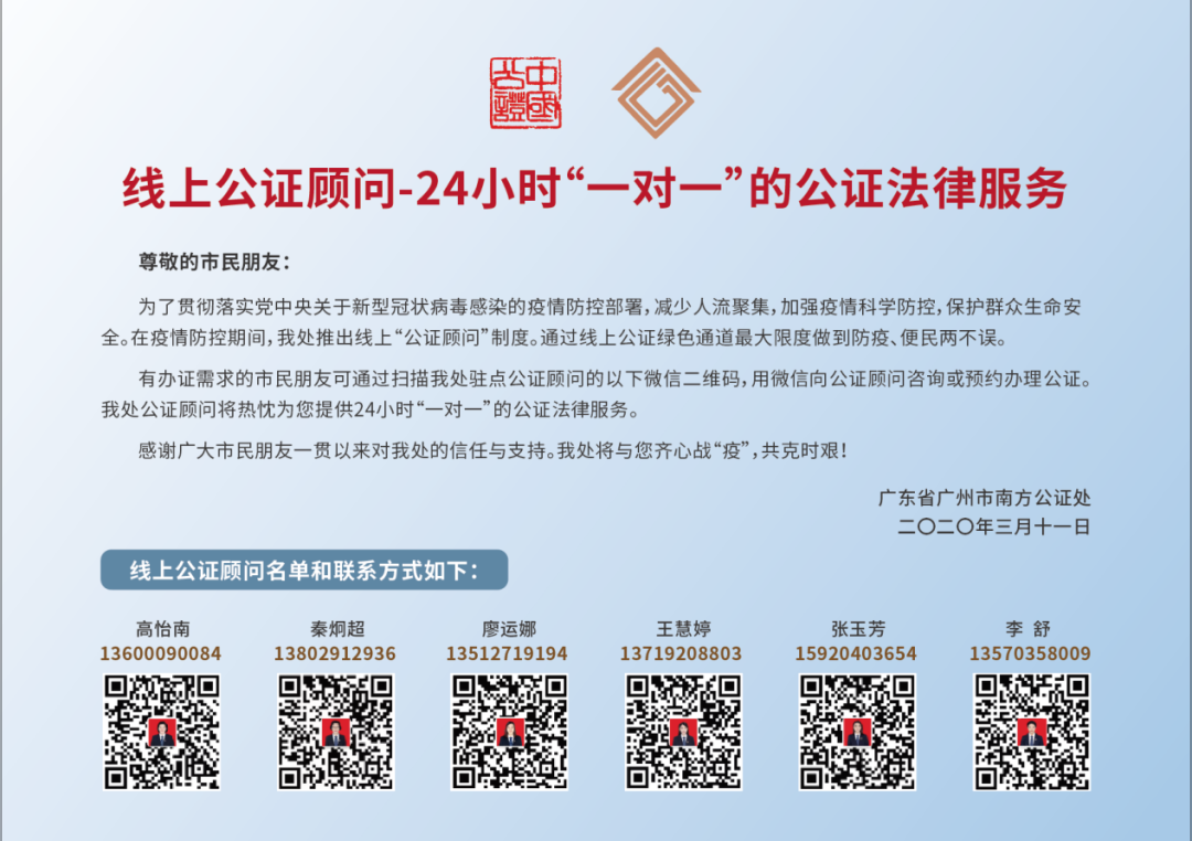 在疫情期间,南方公证处还为居民提供线上公证顾问服务,24小时“一对一”办理公证业务,防疫、便民两不误。扫描相应二维码可直接添加公证员微信,或联系二维码上方的电话号码。