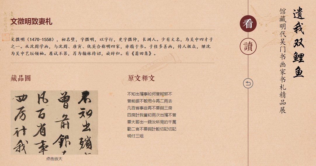 “遗我双鲤鱼”是近年来上海博物馆策划的兼具学术性和互动性的展览,这个展览虽然已经结束许久了,不过网上展览依然非常好玩。展览聚集了49封书札,其中52位有名有姓的写信人和收信人,都是明代吴门地区(今苏州)的著名文人。在这些写给妻子、兄弟、师长、朋友的信中,提到了读书、考试、工作、投资、旅游、看书、吃饭、应酬等日常,读来会感觉非常亲切。