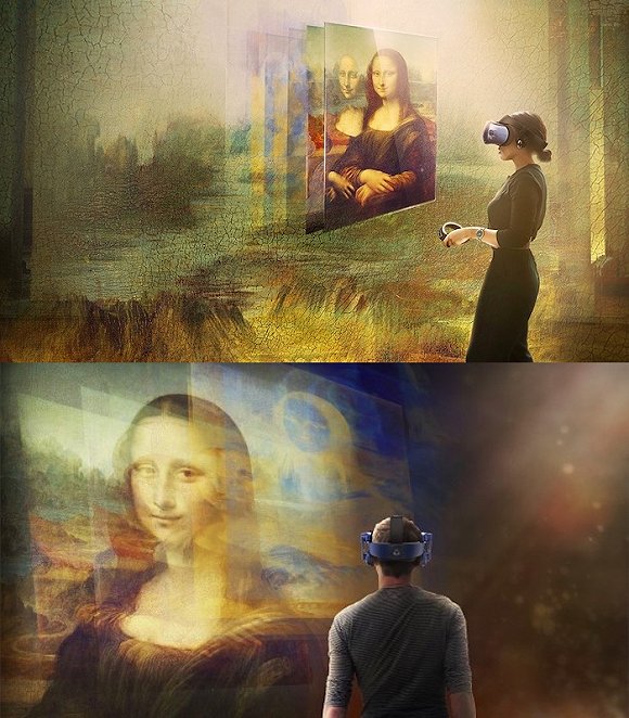 为了使观展更加灵活有效,卢浮宫在2019年10月推出了首个关于《蒙娜丽莎》的虚拟现实体验项目,这也是卢浮宫为纪念达芬奇逝世500周年特展中的一部分。该项目由卢浮宫和HTC Vive Arts合作完成,结合动态图像、声音和互动设计,创造了一种让游客深度参与艺术的方式。通过VR体验,现场参观者可在虚拟空间里与绘画进行实时交互,从而看到肉眼难以捕捉的细节,包括透过漆层看到的木板纹理,以及木板曾经开裂并被巧妙修复的痕迹。无法前往卢浮宫参观的用户则可在VIVEPORT或其他VR平台下载家庭版,欣赏《蒙娜丽莎》以及卢浮宫内其他达芬奇馆藏作品。