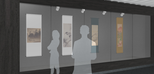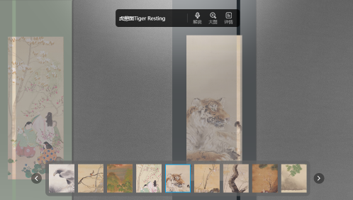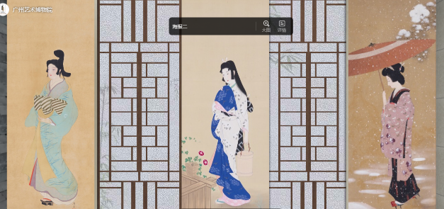 此次日本绘画展在线上线下同步展出,与前不久结束的“春睡梦先觉——纪念高剑父诞辰一百四十周年展”相互呼应,呈现出日本绘画与岭南画派之间的关联。走进3D建模制作的虚拟展厅,观众可以浏览四周的书画,点击虚拟展厅下方的图片栏,配合语音和文字介绍查看详情。