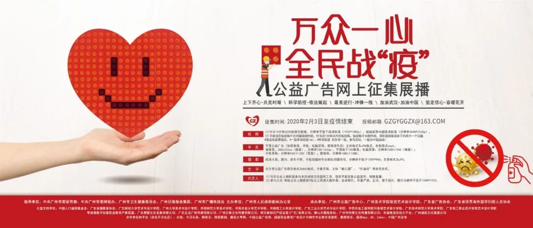 为用好网络平台,展示全国上下在党中央坚强领导下坚决打赢疫情防控人民战争、总体战、阻击战的决心和信心,中共广州市委宣传部、市委网信办、市卫健委等单位指导,市新闻办主办,广州市公益广告中心等单位承办,开展“万众一心 全民战‘疫’”公益广告网上征集展播活动。本次活动采用“边征集,边展播”模式,征集过程中发现优秀作品立即使用,并通过全市各地标大屏、公信屏、电子屏、社区梯间屏等进行集中展播。
