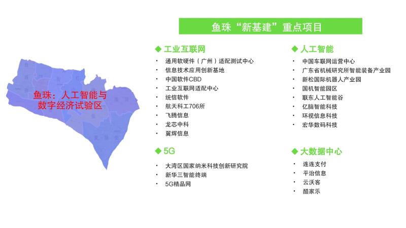 据了解,广州开发区、广州高新区将建设新基建四大片区:鱼珠片区规划人工智能与数字经济试验区,科学城创建工业互联网融合发展示范区,知识城构建通信网络国际数字枢纽,生物岛建设生物安全智慧岛。
