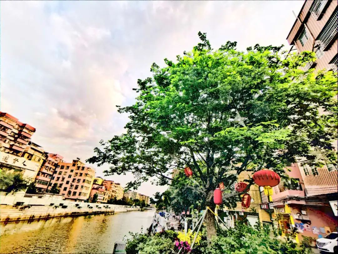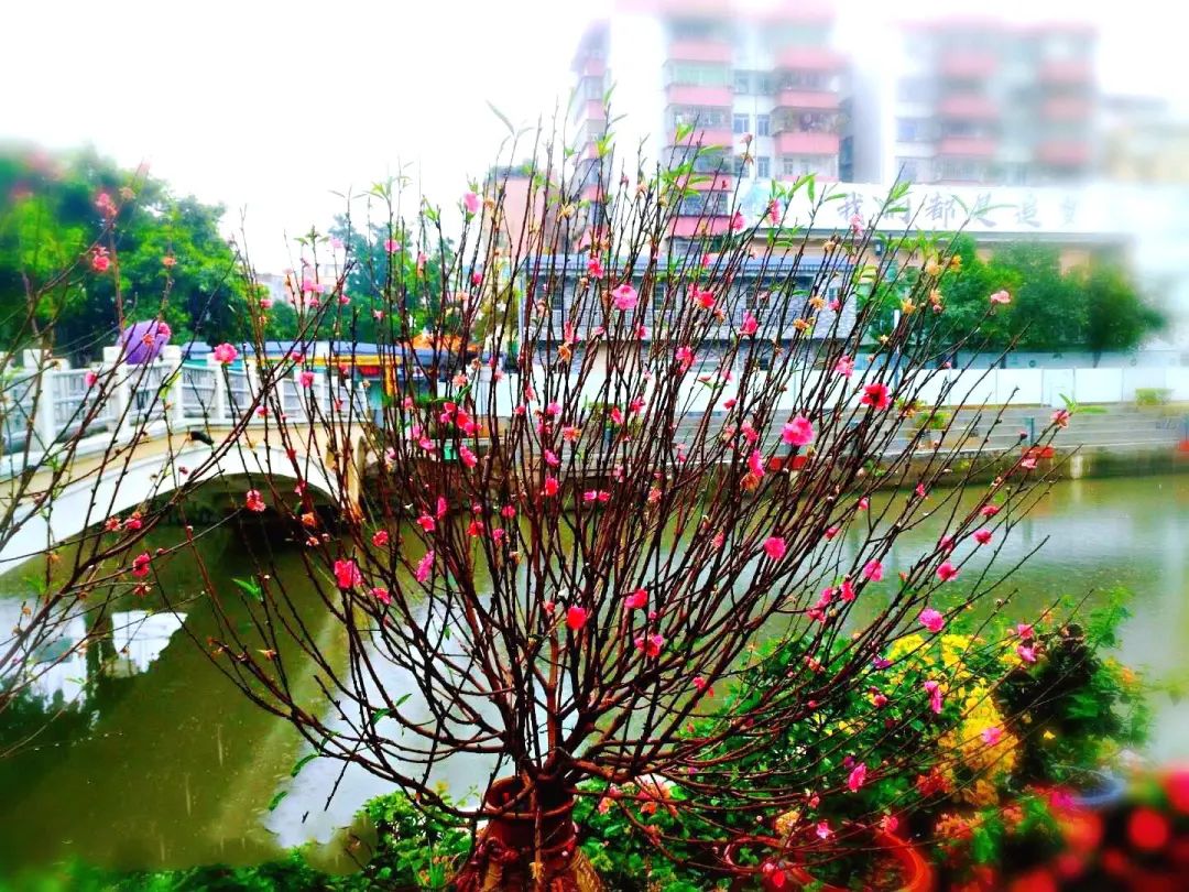 沿车陂涌,寻芳而去。路转车陂龙溪桥,忽见姹紫嫣红,绿浪扑面。一棵朴树,一树清新的嫩绿,生机盎然,正宣告着春来的讯息。朴树下,是一个桥头小花园。