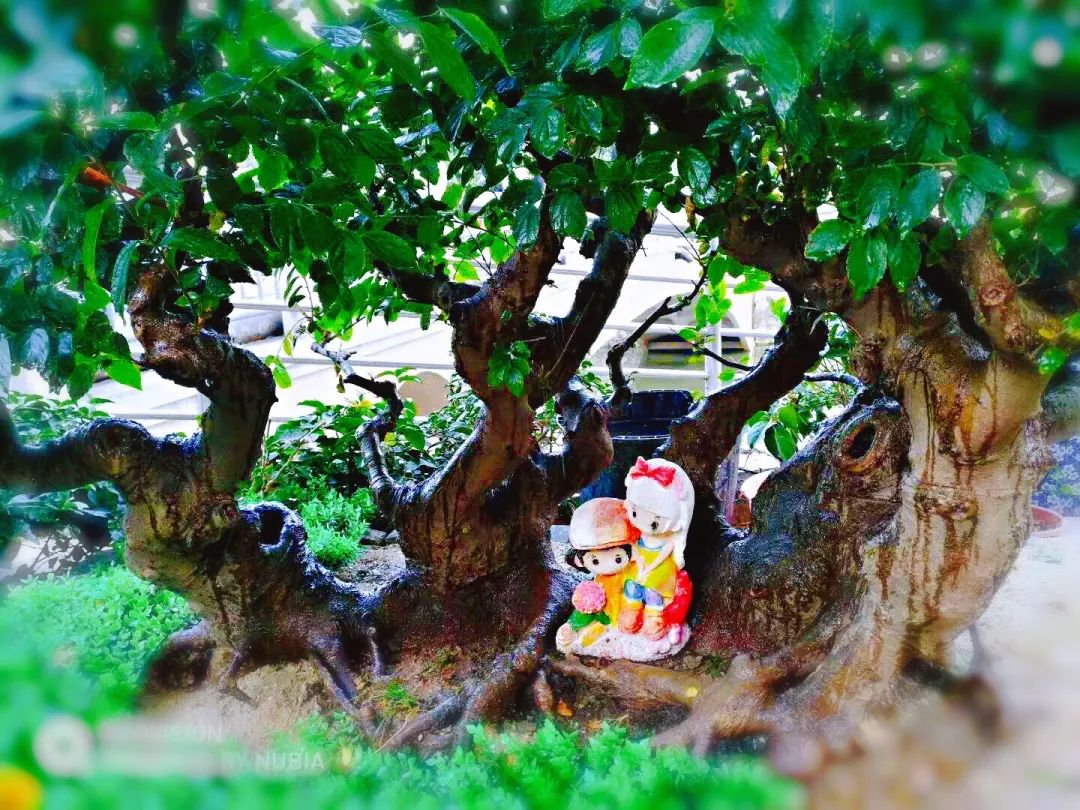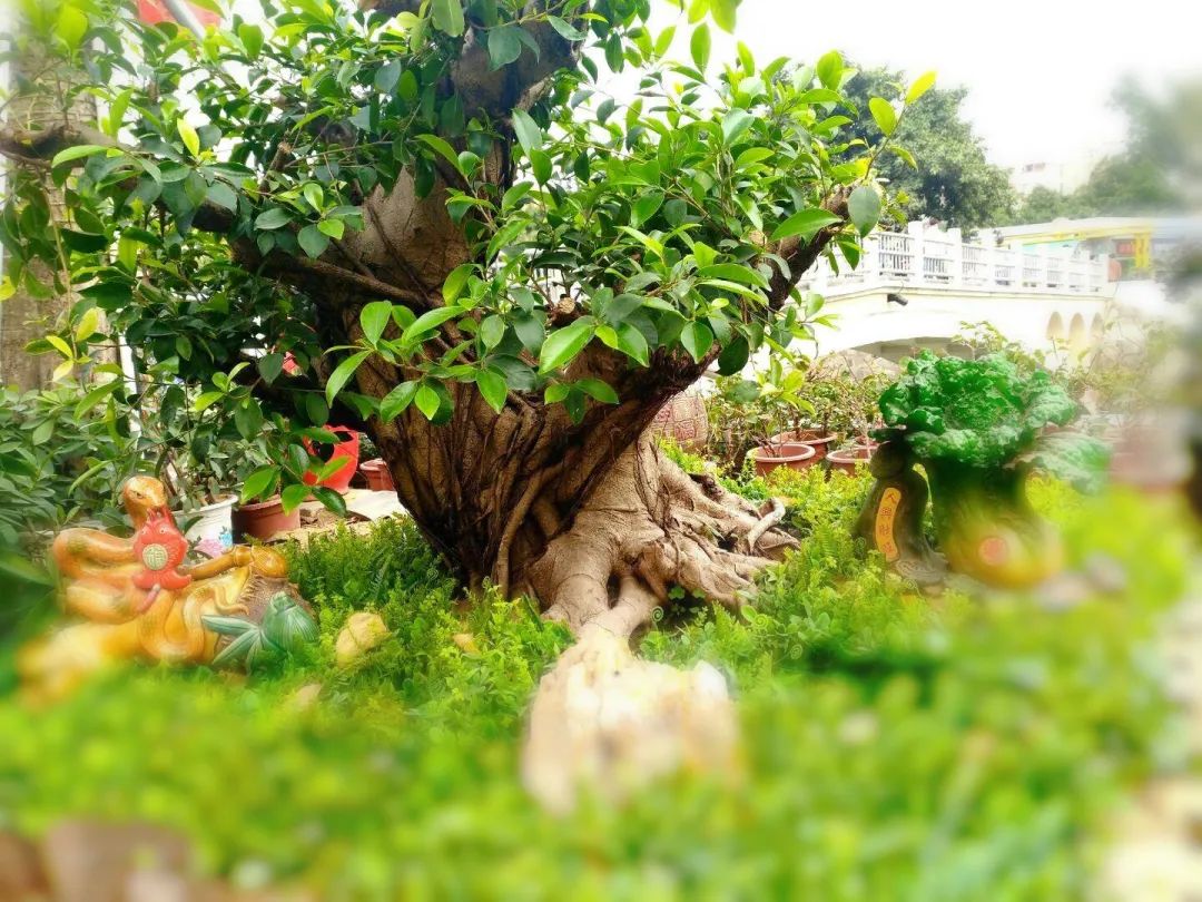 还有花树下的陶瓷小狗小猫小猴,彷如相亲相爱的一家人。还有两棵让人赞叹的盆景!一棵是35年的根似龙爪虬枝盘结的榕树,一棵是45年的相思树。岁月悠悠的两棵盆景,与具有千年历史的村村车陂,颇为相得益彰。