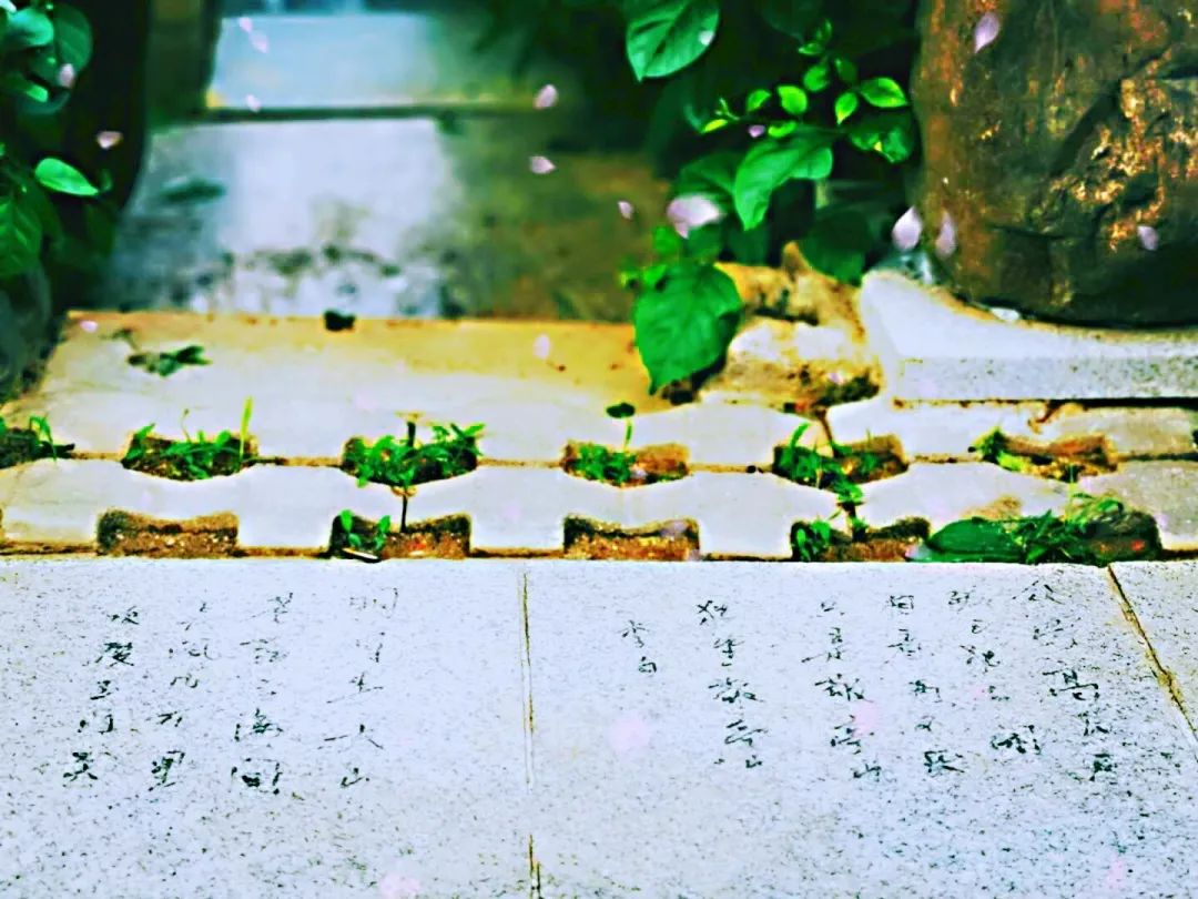 还有好事的车陂村民,小小桥头公园花树下的石板上,用毛笔抄写了诗仙李白两首古诗,尤见车陂人的浪漫文化气息。一首是《独坐敬亭山》:“众鸟高飞尽,孤云独去闲。相看两不厌,只有敬亭山。”一首是《关山月》:“明月出天山,苍茫云海间。长风几万里,吹度玉门关……”