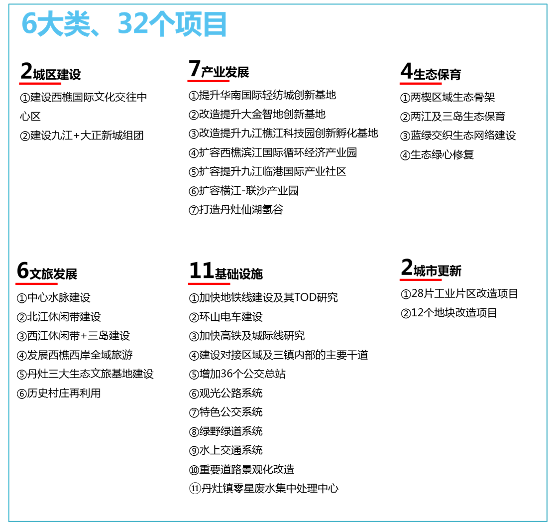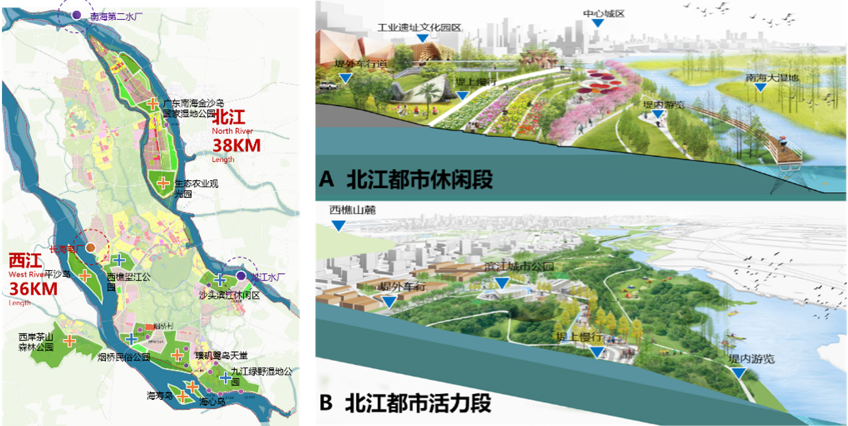 “跨两江、入三岛”,打造超级水岸工程:沿北江及西江形成两江共70公里滨江生态公园,集生态治理、市政工程、市民休闲、体育运动等于一体的超级水岸工程。