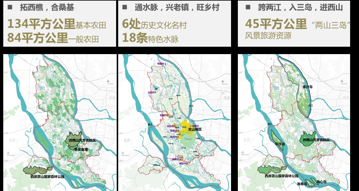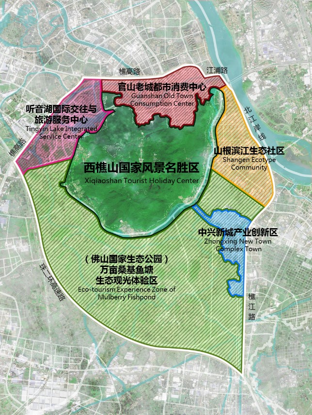 打造“一山两江”,西樵国际文化交往中心区:强化西樵山作为区域公共休闲目的地的优势,以西樵山与听音湖片区为核心,促进山上山下联动发展,集群化整合西樵山国家风景名胜区-听音湖-官山老城-万亩桑基鱼塘-山根社区-中兴新城。同时树立西樵国际文化交往中心区品牌,推动全产业链优化,融合文化体验、交往、培训、度假等多元需求,构建辐射区域的国际文化引领区。