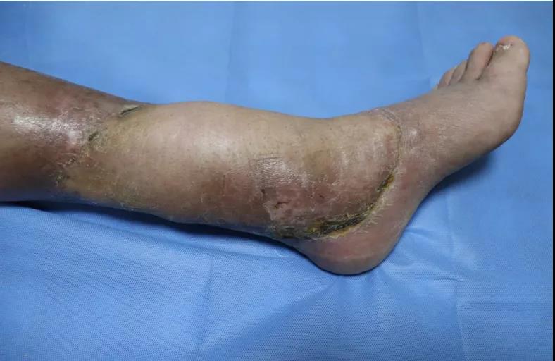 在医院,经过该院医生检查发现,患者左小腿、内踝可见一大小约20cm*10cm大小的溃疡创面,创面周围红肿,有渗液,踝关节活动稍差,各趾端血运尚可,感觉稍差。