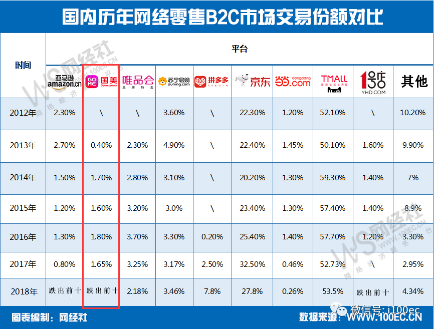 据网经社电子商务研究中心历年发布的《中国网络零售市场数据监测报告》显示,自2016至2018年国美零售市场份额徘徊不进,逐年下滑。依次为1.8%、1.65%、跌出前十。同时,2018年整年依旧呈下降趋势。同时,截止4月1日,京东、苏宁易购、国美零售股价收盘市值分别为:592亿美元、831亿元、149亿元;市盈率分别为:33.75、0.91、亏损。排名退居前十的国美远远落后于京东、苏宁。随着“马太效应”加剧,退居二三线的国美与头部电商平台之间的差距会进一步拉大。