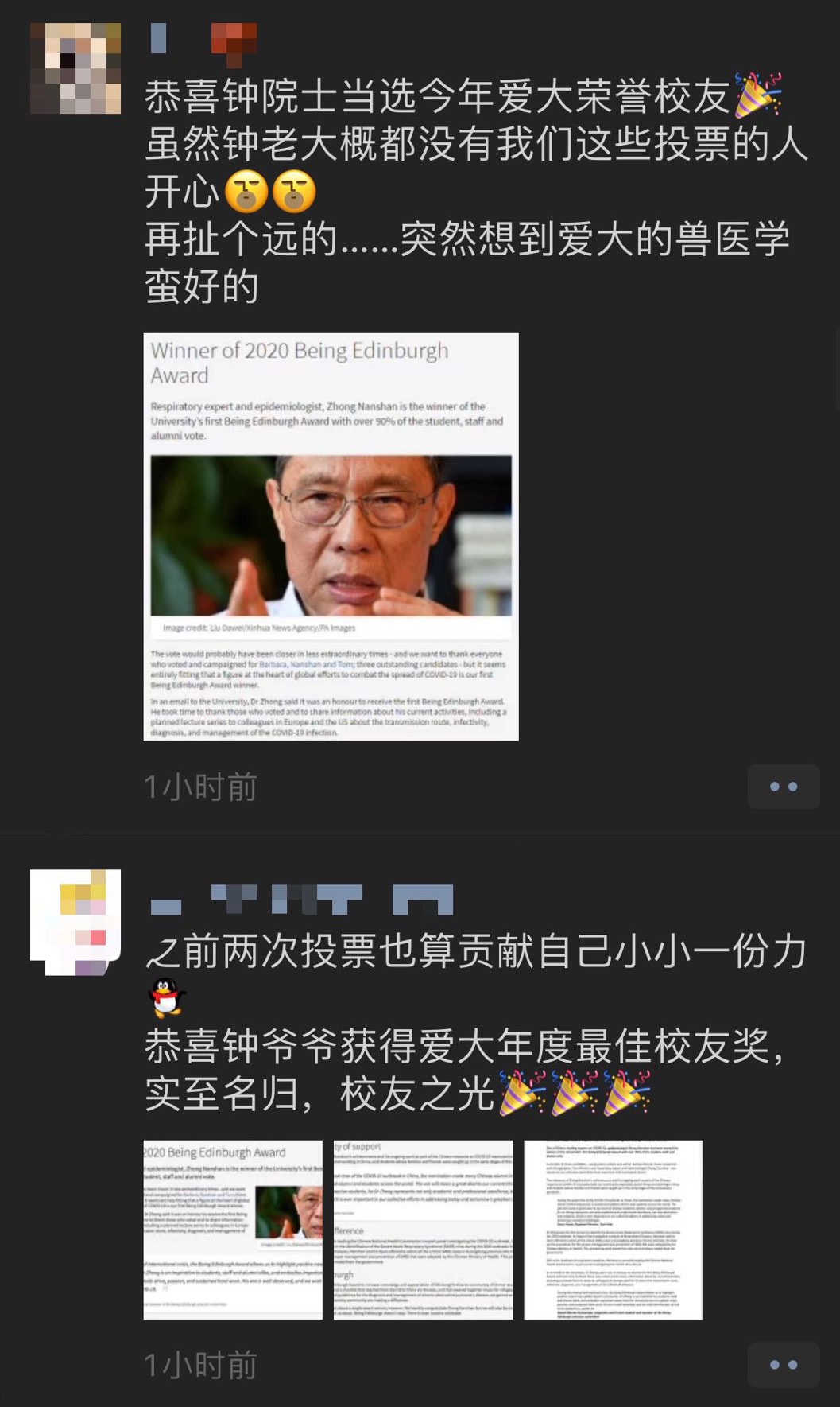 “钟老,牛!”“钟院士值得全世界的人尊敬!”“恭喜钟老获得年度杰出校友奖,吾辈共勉!”……记者观察到,在许多留学生的和该校校友的朋友圈中,祝贺的话语一时刷屏。