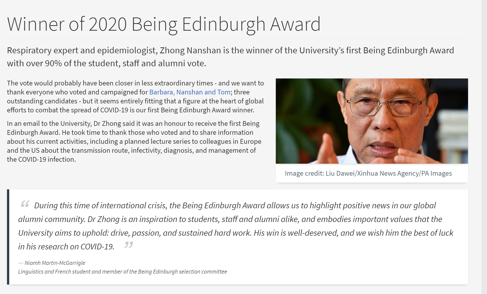 该奖项评选委员会成员尼亚姆·马丁(Niamh Martin-McGarrigle)评价道:“在这个国际面临疫情的时刻,爱丁堡杰出校友奖让我们在全球校友群体中发出积极正面的消息。钟博士对学生、教职员工和校友都是一种激励,他的事迹体现了学校的重要价值观:动力、激情和持续努力。他的胜利是当之无愧的,我们祝钟南山博士关于新冠肺炎的研究能够顺利。”