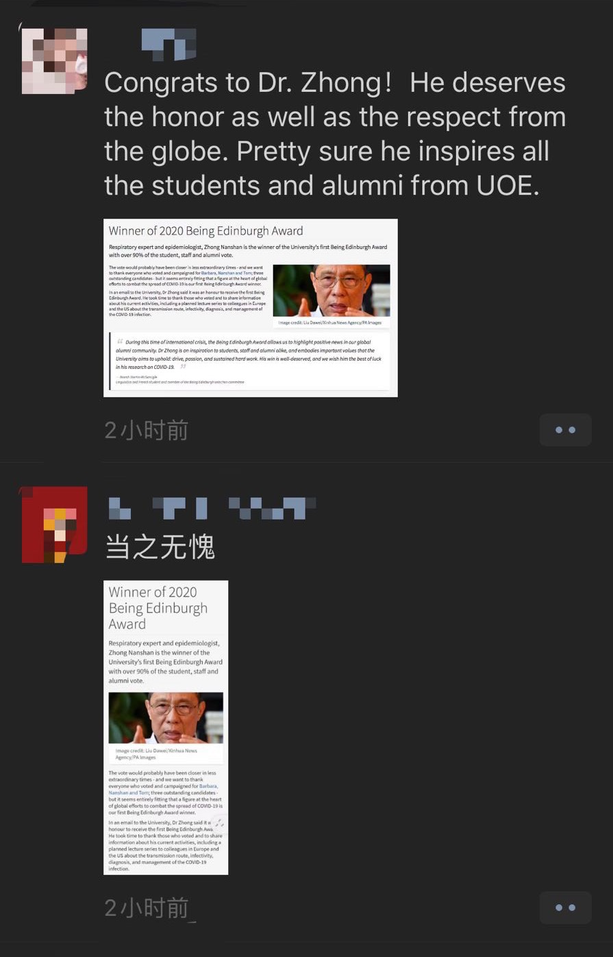 爱丁堡大学东亚地区总监表示,钟老的获奖让许多中国校友无比自豪,还团结了世界各地的校友和学生。“这次获奖对我们现在的中国学生、校友和将来的学生来说意义重大,因为钟博士不仅代表着学术和专业上的卓越,也代表着奉献和正直,这在我们共同努力应对今后挑战时是至关重要的。”