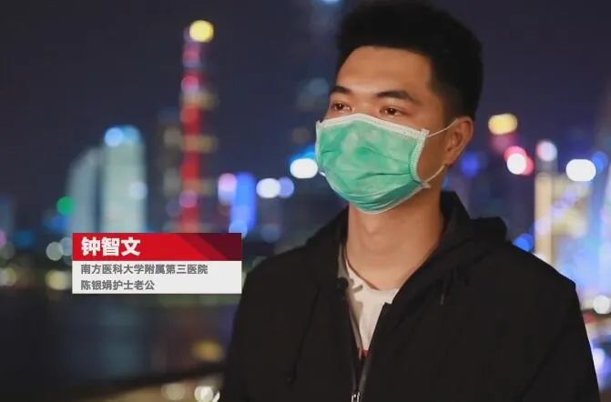 南方医科大学附属第三医院陈银娟护士老公钟智文:现在我爱人在湖北武汉的雷神山医院,还在临床一线的ICU里面,心里面很担心她的。但她的这种大爱举动,作为她的家属很荣幸。“你辛苦了,回来我熬你最喜欢喝的汤喂你喝。”