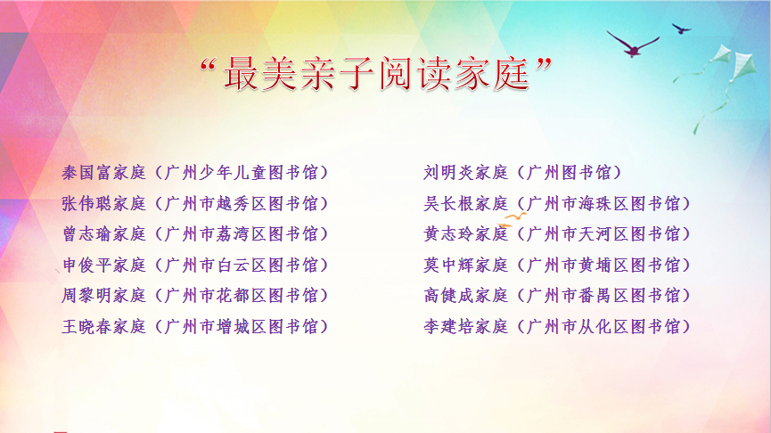 年度利用图书馆频率较高的12个读者家庭获选“最美亲子阅读家庭”,其中的代表为广州少儿图书馆的秦国富家庭,自从发现广州少年儿童图书馆外文馆这个原版英文图书的宝库以来,孩子和父母便成了广州少儿图书馆的忠实粉丝,2019年度全家借阅了超过1000 册少儿原版外文书籍、约400册的国内出版的少儿图书,因为很早开始亲子阅读,孩子对语言非常敏感,词汇量很丰富,现4岁多已能自行阅读相对复杂的英文绘本,父母由衷地感谢图书馆为孩子提供精美的书籍、给他的成长插上了翅膀,也营造了家庭的良好阅读氛围。